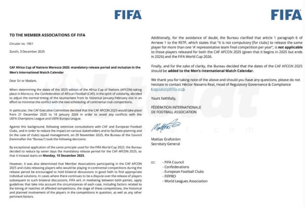 La circulaire rappelle le contexte particulier de cette édition. Traditionnellement jouée en janvier-février, la CAN a été décalée à la période du 21 décembre 2025 au 18 janvier 2026 . Selon la FIFA et la CAF, ce glissement vise à « minimiser les conflits » avec le nouveau format de la Ligue des Champions et de la Ligue Europa de l’UEFA.
