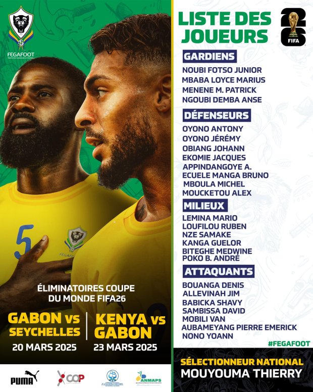 Après quelques mois de pause, la sélection fanion des Panthères du Gabon s’apprête à reprendre du service dès la semaine prochaine dans le cadre de ces qualifications. Pour y parvenir, le technicien gabonais Thierry Mouyouma a dévoilé une liste de 25 joueurs, composée de 4 gardiens, 8 défenseurs, 6 milieux de terrain et 7 attaquants. Parmi eux, on note la présence de cadres tels que Guelor Kanga, Bruno Ecuele Manga, Mario Lemina, Denis Bouanga et le capitaine Pierre-Emerick Aubameyang.